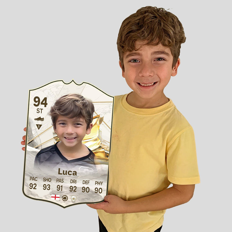 When it comes to personalising your card, the basic steps are to upload a photo and add a name to your card. Then you’ll add details like your player’s position and skill ratings out of 99 for each football skill shown on the card. Our online card builder makes this really easy. And if you aren’t a football card expert, don’t worry!