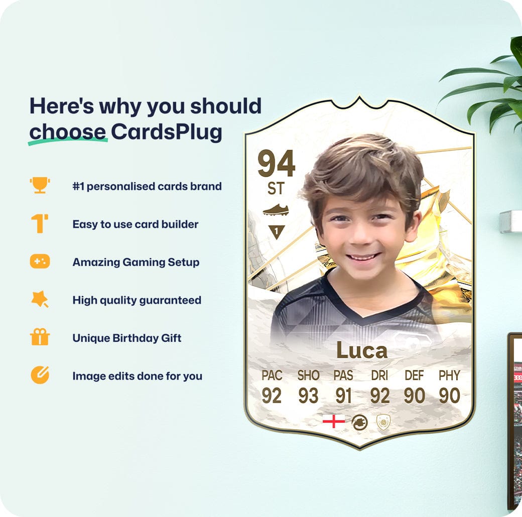 CardsPlug is home to the world’s favourite personalised football cards. Our easy football card builder lets you make a real life football card with your own name, photo, and skill ratings. With 100+ designs to choose from and some inspired by EA SPORTS FC 26 cards seen in EA FC 26, EA FC 25 and FC 24 as well as FIFA cards seen in games like FIFA 23 and FIFA 22.