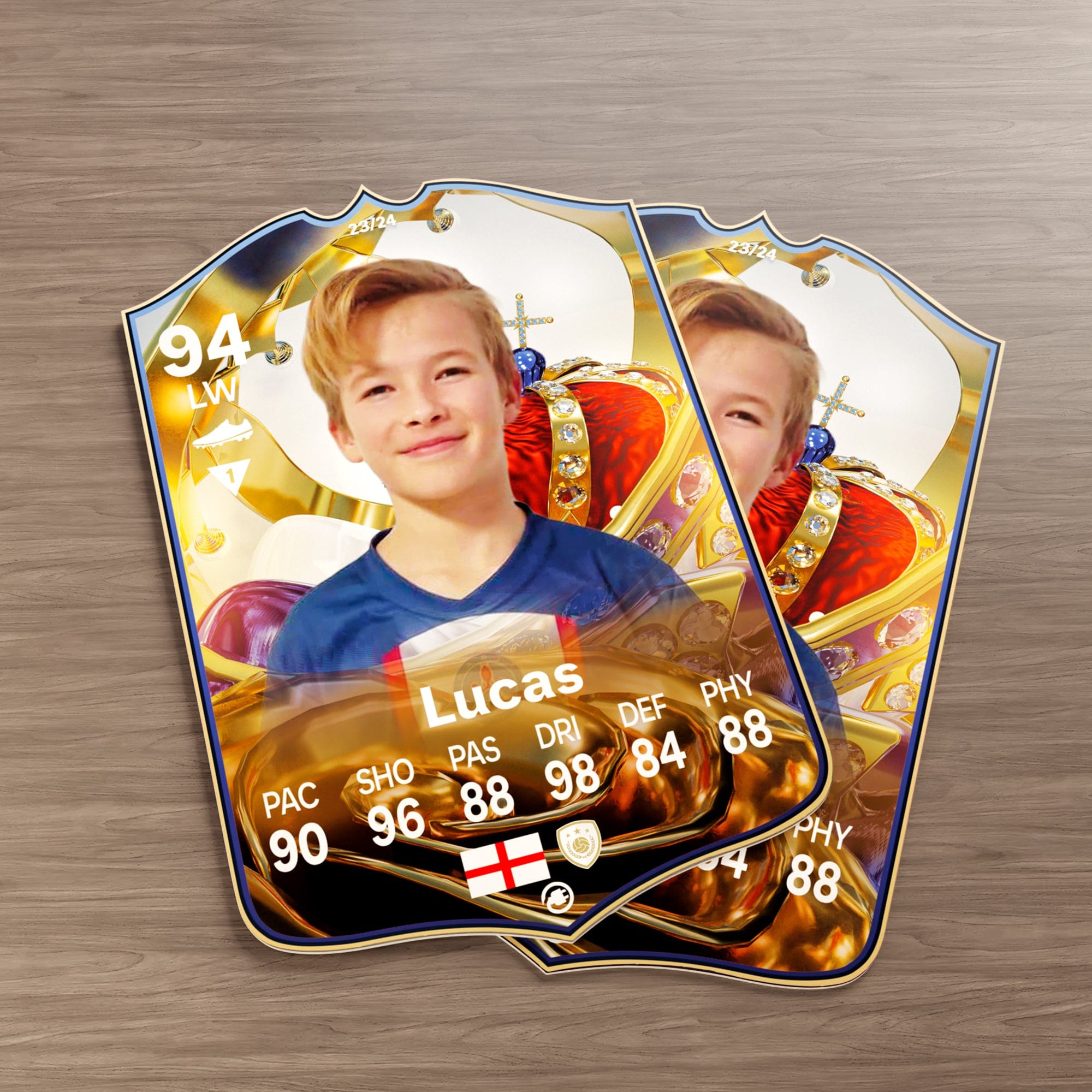 Our football card builder lets you choose between two different card materials. Our Standard cards are made of a ultra-strong variety of Foamex (not cardboard or foam!). This material has a lovely gloss finish and is also super durable. Our world-exclusive Metal football cards have a matte finish and are slightly heavier. Both look amazing and will last forever.