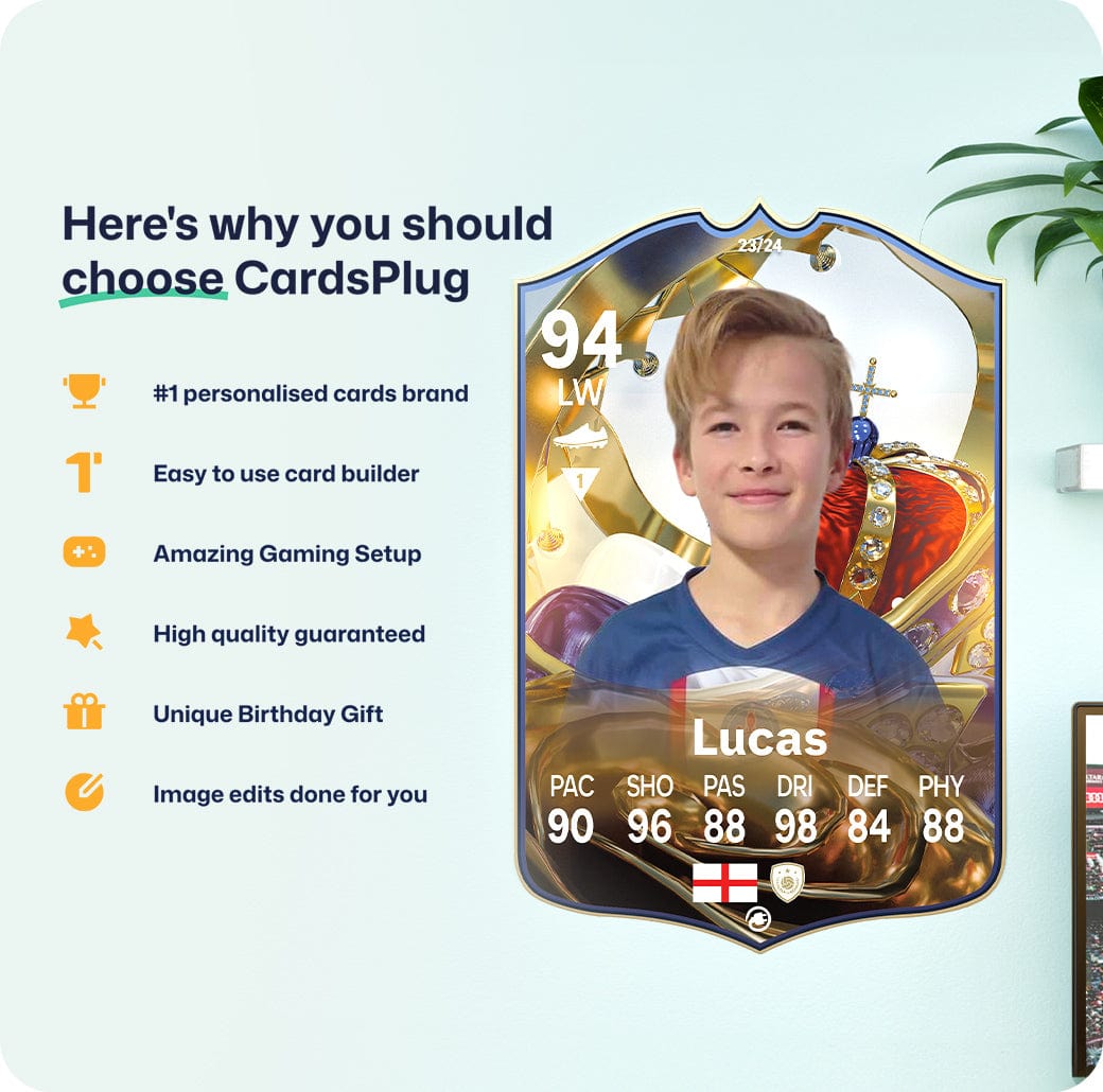 CardsPlug is home to the world’s favourite personalised football cards. Our easy football card builder lets you make a real life football card with your own name, photo, and skill ratings. With 100+ designs to choose from and some inspired by EA SPORTS FC 26 cards seen in EA FC 26, EA FC 25 and FC 24 as well as FIFA cards seen in games like FIFA 23 and FIFA 22.