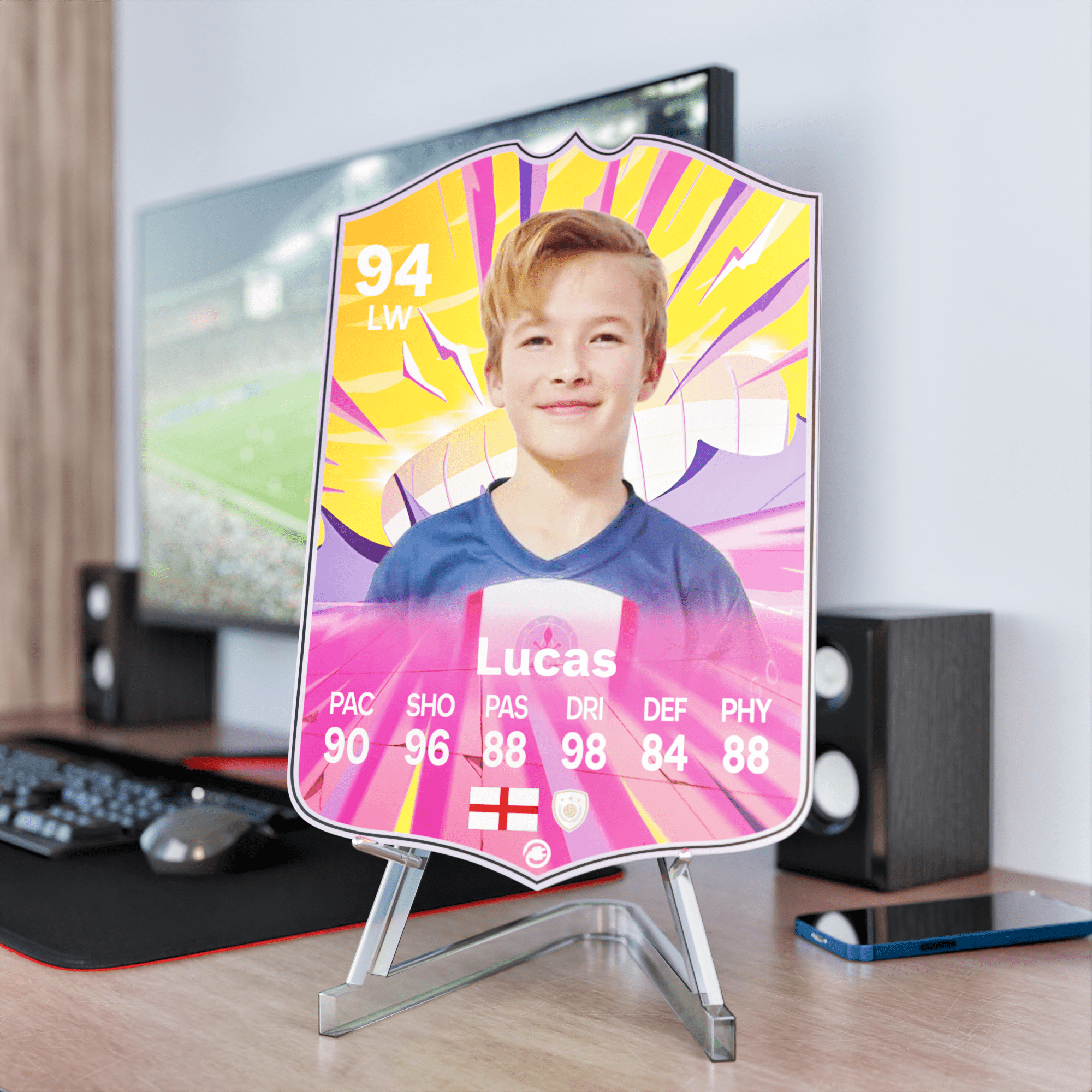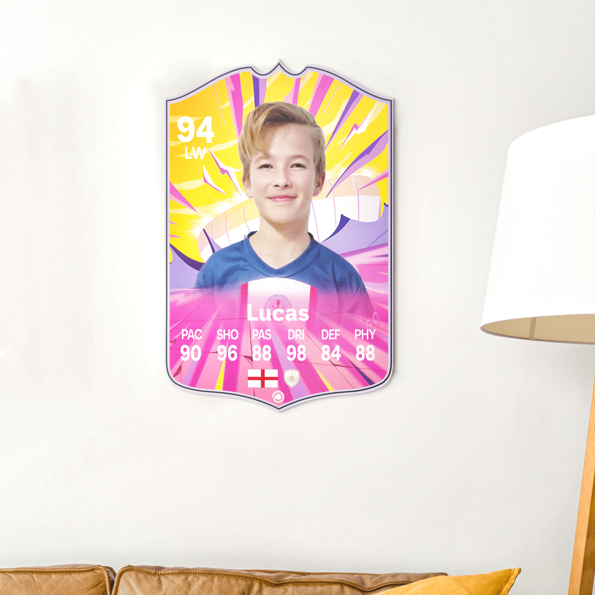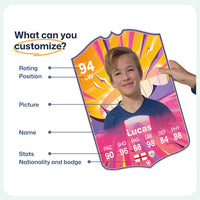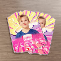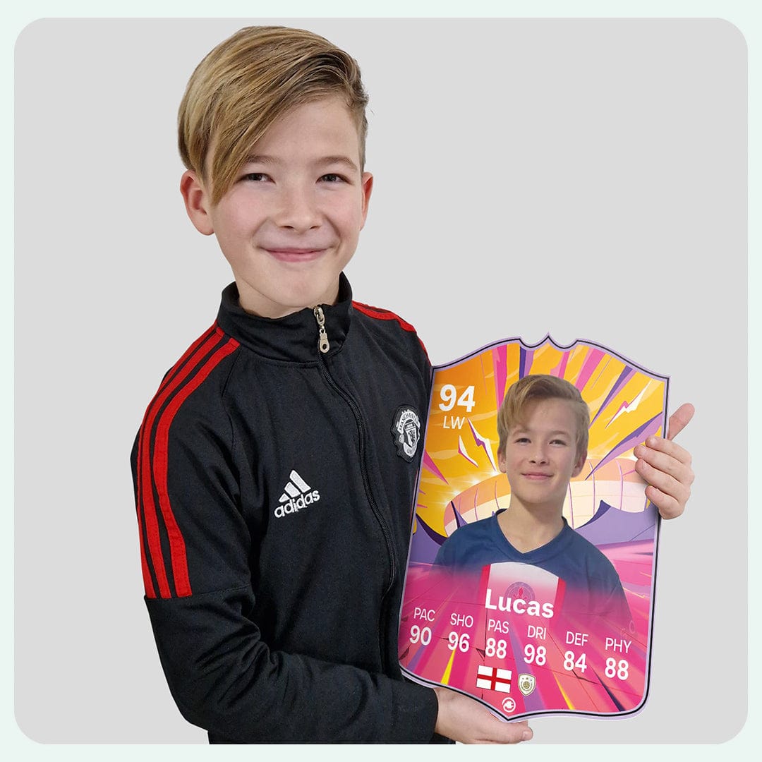 When it comes to personalising your card, the basic steps are to upload a photo and add a name to your card. Then you’ll add details like your player’s position and skill ratings out of 99 for each football skill shown on the card. Our online card builder makes this really easy. And if you aren’t a football card expert, don’t worry!